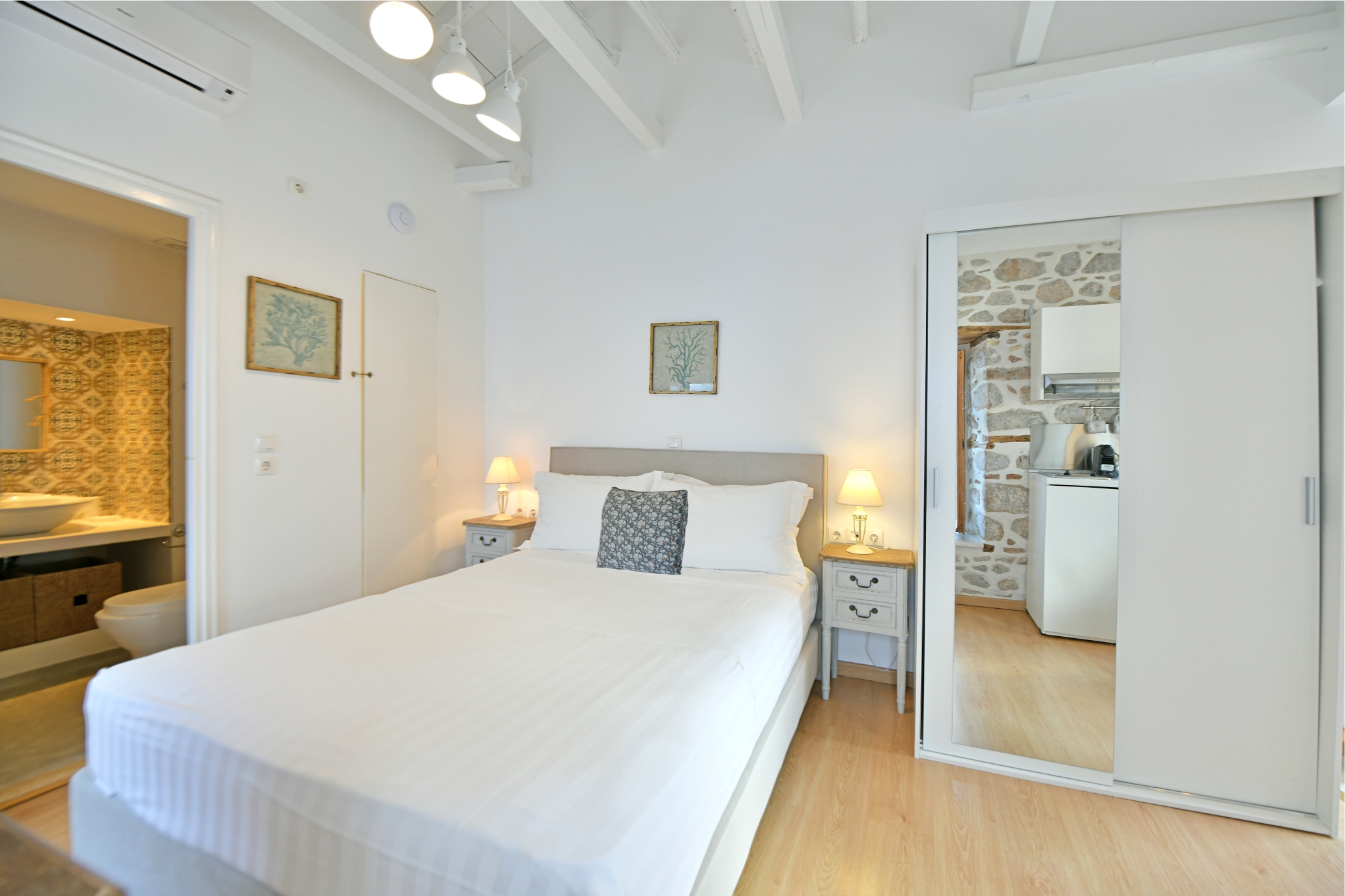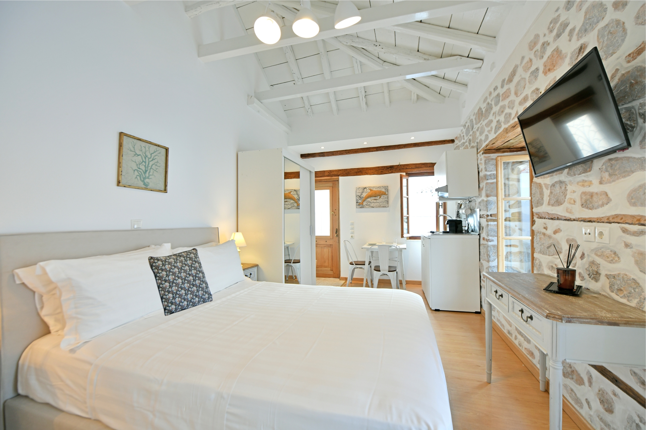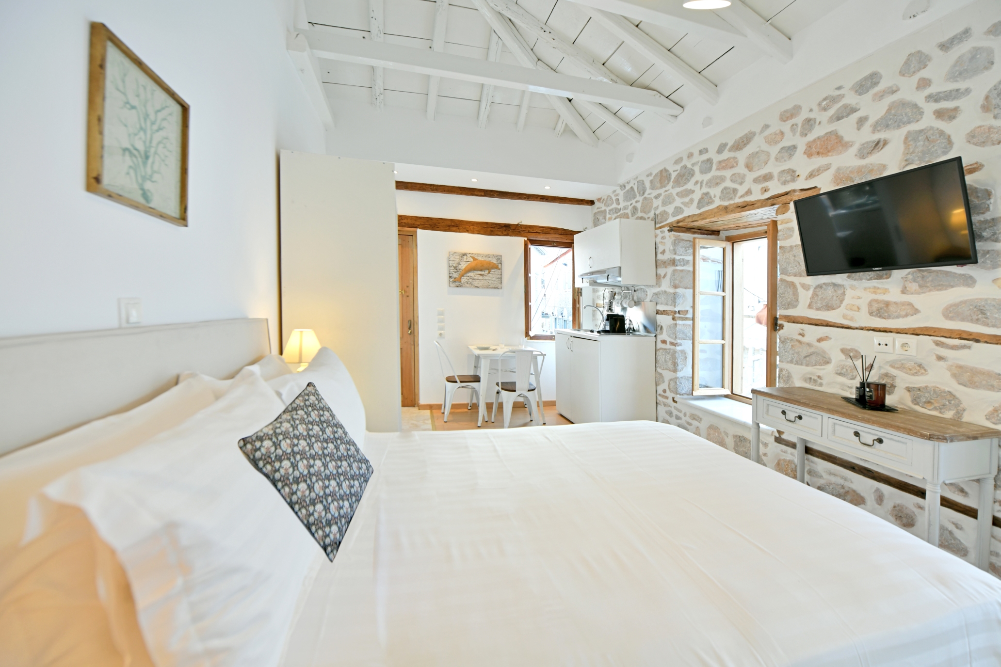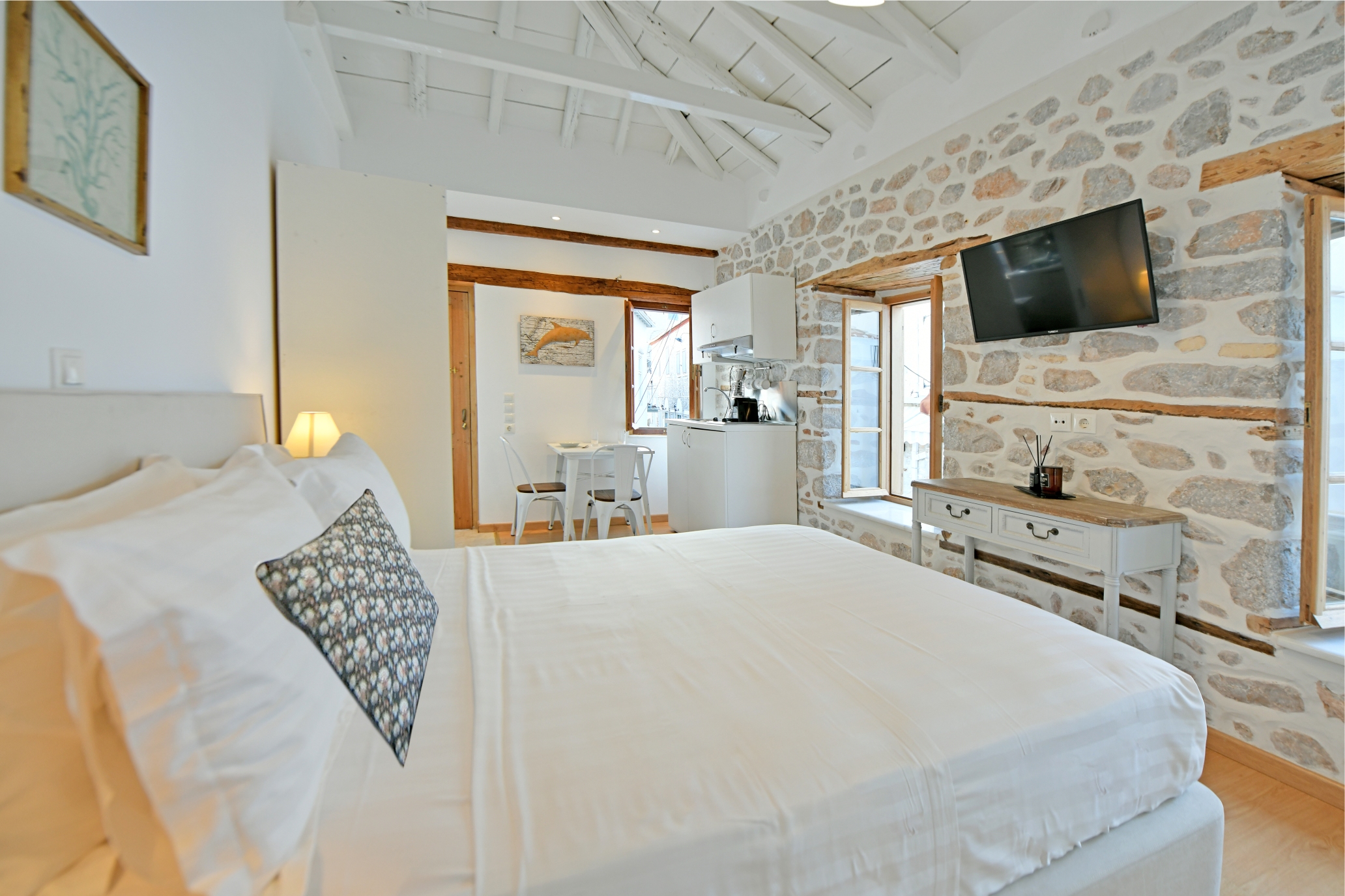 Διαμέρισμα 1ου, θέα σοκάκια “Kalamaraki” : Πρόσφατα ανακαινισμένη Ελληνική παραδοσιακή πέτρινη κατοικία 1ου ορόφου με θέα στα γραφικά σοκάκια της Ύδρας περίπου 23 τετραγωνικά μέτρων με δικιά του είσοδο, με μικρή κουζίνα , τραπεζαρία και μεγάλο διπλό κρεβάτι. Ακριβώς στην καρδιά της κομψής Ύδρας ,δίπλα από το ρολόι, το λιμάνι και τα καταστήματα.